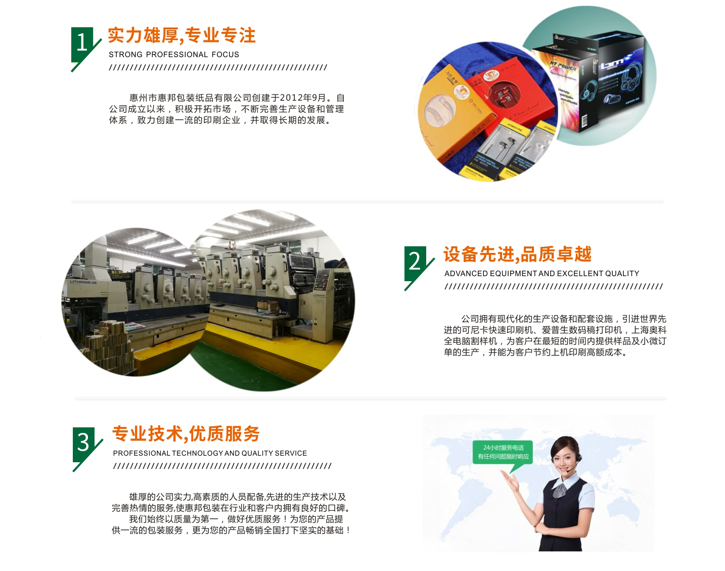 惠州市惠(hui)邦包裝紙品有(you)限公司創建于(yu)2025年12月。自公司成(chéng)立以來,積極開(kāi)拓市場,不斷完(wan)善生産設備和(hé)管理體系,緻力(lì)創建實力型印(yìn)刷企業,并取得(de)長期的發展㊙️。擁(yōng)有一🧑🏾🤝🧑🏼批具有高(gāo)水平、敬業愛崗(gǎng)的員工50多名。